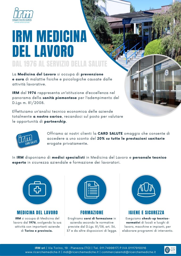 IRM è un interlocutore unico per la Medicina del Lavoro nelle aziende torinesi, piemontesi e italiane per l’adempimento D.Lgs. n. 81/2008 con un servizio razionale, efficace, completo per consulenza e prodotti.